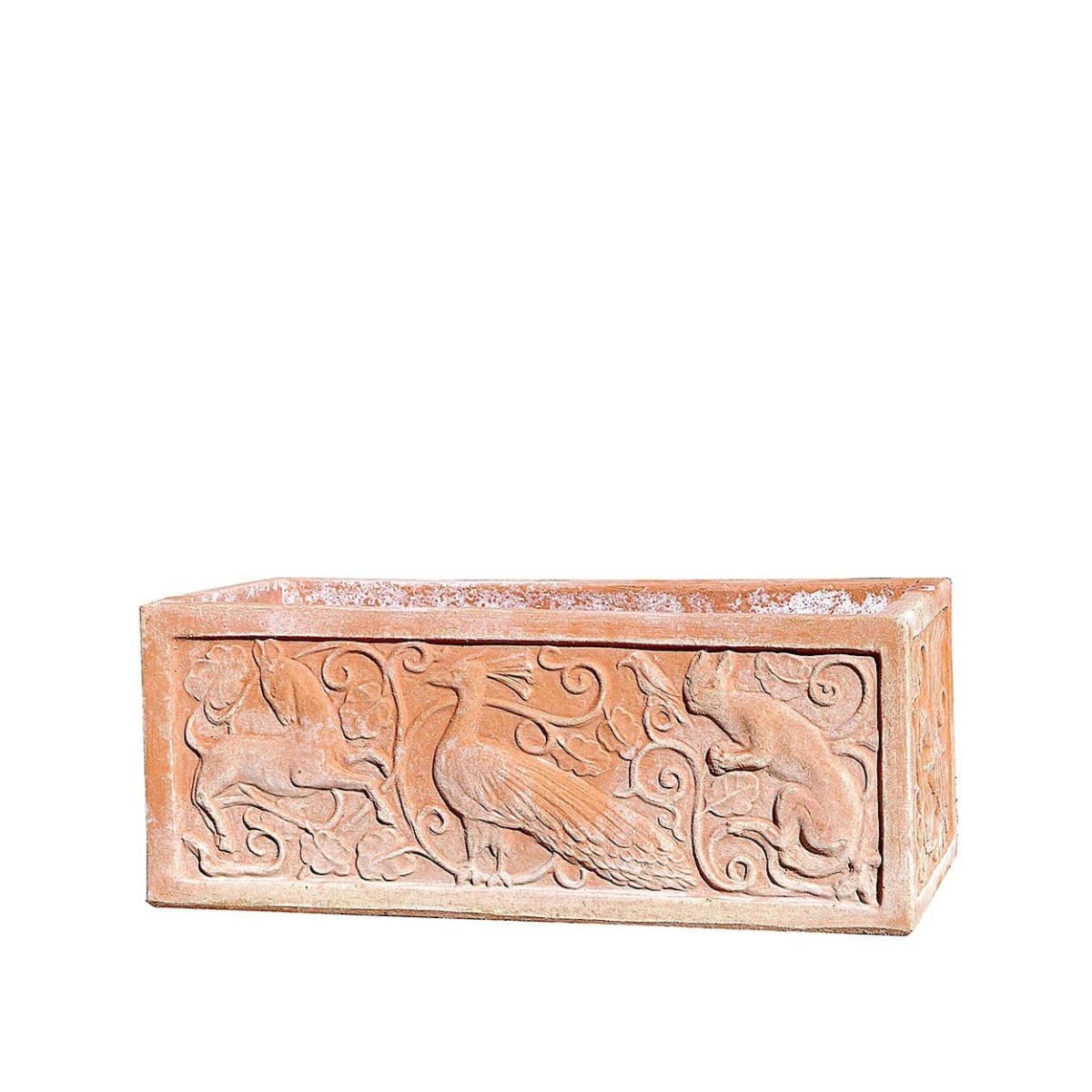 Luxusní terakotový květinový box Byzantine s reliéfem páva a zvířecích motivů inspirovaný byzantským uměním. Ručně vyráběný z pravé terakoty z Imprunety, mrazuvzdorný až do −30 °C. Dekorativní zahradní nádoba, která spojuje přírodní motivy s historickou elegancí.
