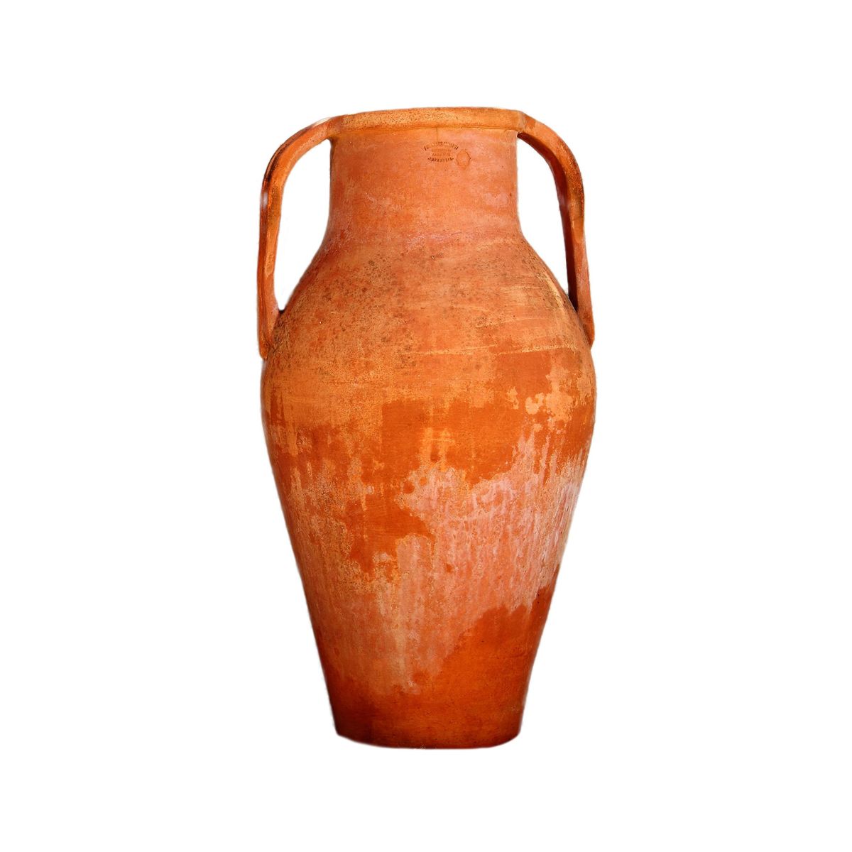 Terakotová amfora s kulatými uchy představuje dokonalou rovnováhu mezi tradiční formou a jemnou elegancí. Hladký povrch bez zdobení nechává vyniknout přirozenou krásu imprunetské terakoty a její autentickou strukturu.