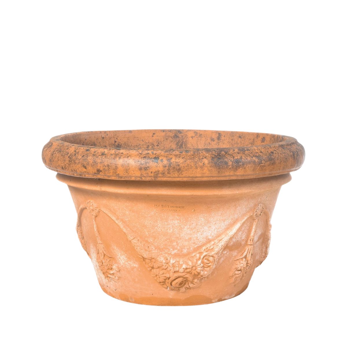 Tento nízký terakotový květináč vyniká svým dekorativním reliéfem inspirovaným klasickými italskými motivy. Ornamentální girlandy dodávají květináči elegantní a historizující vzhled, který se skvěle hodí do reprezentativních zahradních prostor.