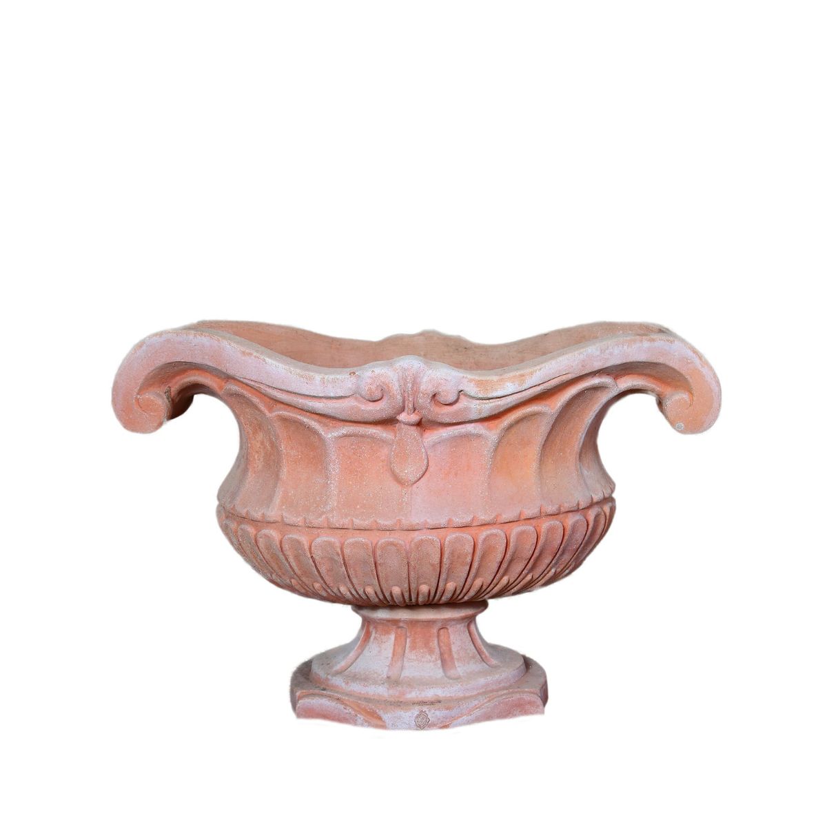 Luxusní terakotový květináč ve tvaru barokní vázy na podstavci. Bohatě zdobený, ručně vyráběný v Imprunetě a mrazuvzdorný. Ideální jako reprezentativní solitér pro zahrady i vstupní prostory.