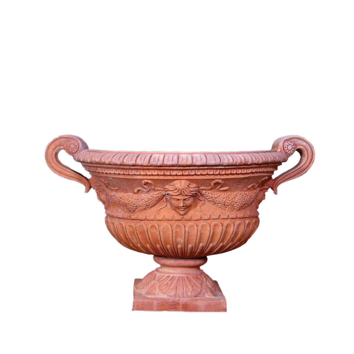 Ozdobná oválná váza s podstavcem z pravé imprunetské terakoty představuje nadčasový prvek zahradní i architektonické dekorace. Díky svému tvaru je ideální pro umístění na sloupy, brány, zídky nebo jako samostatně stojící dominanta prostoru.